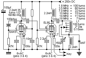 This transmitter is very stable and will deliver up to seven watts of power. Do not be put-off by valves as they are VERY easy to work with and it seems that there are quite a few valves around. Because no-one wants these obsolete things they may be bought for next to nothing at radio rally's. If you are not too particular what type of valve you want then there are lots of valves available. Above is the circuit of the transmitter with the coil winding information. The oscillatoar is a Pierce oscillator circuit which will oscillate at the fundamental frequency of the crystal. A 25pf variable capacitor between the grid of the first valve and earth will allow the final frequency to be "pulled" a little. The RF choke in the anode of the two valves is made up of 34 turns of enamelled wire wound on a 1/2" ferrite ring (2.2mH). The output tank circuit is wound on a piece of 2" dia plastic conduit tube. The object is to have as many turns of wire in circuit as it is possible to have on the band of interest. The output tuning capacitor should normally be set to about 10% when selecting the tapping for any particular band. The cathode resistor and 2.2uf capacitor give quite a nice envelope to the keyed output. When the key is UP (off) there is about 100 volts DC across the 2.2uf so this component must be rated in excess of 100v. I obtained mine from an old telephone as telephones nearly always have a 2.2uf 250v non-electrolytic capacitor somewhere in the circuit. The oscillator is un-tuned so the only tuning procedure required is to select the band (coil tapping) and peak it for maximum RF output. The valves used were selected because they had B7G bases and were the first I put my hand on when I reached into my junk-box. Virtually any pentode valves will work in this application. An EL84, for example, will deliver over ten watts in this circuit but the valves quoted will deliver seven watts from 3.5 to 30 MHz. If you should use another tube then don't forget to check the screen voltage. If it is less than 250v then you will need a resistor in the screen supply to the valve. Have fun, de HARRY, Upplands Vasby, Sweden