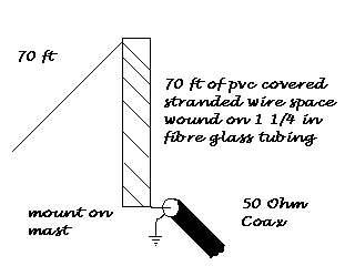 It consists of 140 feet of insulated wire, the first half of which (70 feet) is space wound on an insulated tube. I used glass fibre tubing which was to hand, but PVC may be used also. My tube is 1 1/2 inches in diameter and about 5 feet 6 inches long. The turns are about 0.5 inches apart. The other 70 feet of wire acts as a loading wire and slope down from the top of the coil to near ground level. The system is coax fed to the base of the coil, with the shield or braiding going to earth.