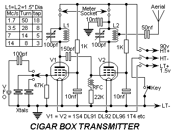 The station is solely intended for code work as it stands, keying being carried out in the negative HT circuit of the oscillator valve. The theoretical diagram is given in Fig. 1 andthe layout in Fig. 2. The batteries, naturally are not included in the cigar box case; that would be asking too much. However, as originally planned and constructed, a simple three- valve TRF receiver, using miniature valves, occupied one half of the case and the transmitter the other half. It is felt that readers would not be greatly interested in the receiver and would probably prefer to use one they already own or to build one to their own design rather than attempt to build both receiver and transmitter into such a small case. Nevertheless, if readers express interest in the receiver too, all pertinent details will be given at a later date.The coil data is given on below for all bands in common use. When these coils have been wound and the little transmitter assembled and its wiring checked it should be attached to a half-wave end-fed aerial of 66ft. in length, and the 7 Mc/s crystalswitched into circuit. The meter should be plugged into the sockets in the anode circuit of the oscillator valve, and the circuit tuned to resonance by means of the variable condenser in the circuit. This will be indicated by a "dip" in the anode current as shown on the meter, in other words a reduction in the anode current. The meter should then be removed and the socket shorted together with a "U" link, two plugs joined by a sturdy piece of wire. The same procedure should then be gone through with the power amplifier, then the transmitter is ready to go on 7 Mc/s. Naturally it will be necessary to tune in this way whenever the frequency is changed, but the procedure takes only a minute or two at most.