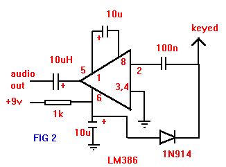 The two switched capacitors in series with the crystal are 1000pF and 40pF and, with the switch used as a T/R switch, give 600Hz offset. A PP3 9v battery is used to power the rig. Suitable transistors for the transmit portion (fig 1) would be BC107/BC108 etc for the crystal oscillator and an 2N3866/2N3053/BF51 etc in the 'PA'. The crystal is an 80m one - 3.560 mHz being the QRP activity channel. Figure 2 shows the receive side.