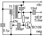In the circuit given, T1 is a first IF transformer, from another one of these cheap radio's. The capacitor "c" is built into the IF transformer. Couple the output of this circuit to the 1 st IF transformer of the radio to be modified and peak the first 1 st IF for maximum received signal. Peak the transformer in the Q-multiplier circuit for maximum received signal then increase the 47K until oscillation just begins (you will hear a STRONG beat note). Re-adjust the transformer of the Q-multiplier for "Zero-Beat" (lowest frequency tone). Turn the 47K pot back until the tone just stops. That's it!!