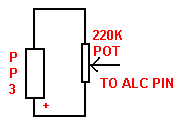This idea has appeared a number of times in QRP magazines, including Sprat and the particular article I quote from was in Sprat 61, by G4MYB, when he describes how, by applying a negative voltage to the ALC pins of the TS520S's ancillary socket, power control down to milliwatts is possible. The circuit is as above, and it can be seen that only a 9 volt battery and a 220k potentiometer are needed, plus a bit of cable and a suitable box. The positive side of the PP3 goes to earth. The latter need not be screened as only DC is enclosed. The battery life will be long, a typical current being 34 microamps, passing through the pot. As the ALC arrangement is pretty standard in the range of Kenwood/Trio, it may be applied to other rigs than the TS520S used by G4MYB. In the case of the '520S, the negative voltage is applied to pin 6, whilst pin 4 is earth.