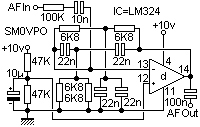 Direct Conversion and other simple receiver have quite a wide bandwidth which can make life a little difficult when copying weak CW stations, especially if the band is a little crowded. This circuit uses a single Op-Amp together with a Twin-T filter to provide a very narrow AF filter. Before anyone jumps in to tell me the Twin-T is a NOTCH filter - yes, but it is used here in a feedback loop which shunts the high 100K input impedance, until the input frequency is at the Twin-T notch frequency. This circuit is centered around 900 Hz and is fixed at this frequency by the filter. The circuit has no gain and should be used between the receiver volume control and the AF amplifier. NOTES The output level of both these circuits may be altered, by changing the value of the 47K feedback resistor from the output of the (last) Op-Amp, to its -ve input. The unused Op-Amp in the NOTCH FILTER may be used for the CW-FILTER circuit. If you do then you can also delete the two 47 K resistors and 10 uF capacitor supply splitter. This circuit already exists in the Notch Filter and may be used to bias the + input of the Op-Amp in the CW-Filter. Have fun, de HARRY, Upplands Vasby, Sweden