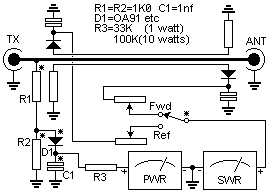 Add the extra components shown in SWR-PWR.GIF and highlighted with an asterix (*). Connect the diode to the existing Left-Hand (power) meter to give a true power indication. The values shown assume the meter is 100uA movement and the full scale reading required is 10 watts. Note that the scale follows a square law and although FSD=10 watts, 10% FSD is equal to 100mW. This reading is accurate for almost any frequency from 1.5 MHz to 200 MHz. For 70cm (430 MHz) a correction capacitor can be placed across the upper RF voltage divider (R1); the value selected for the correct power at 432 MHz. My meter needed a 6.8pf correction capacitor.