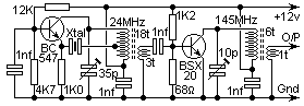 Above is the circuit diagram of a VHF 145MHz oscillator that can be used to receive the 2 meter band. The crystal is a 2-meter 8MHz type (Kenwood 2200) but 12MHz crystals will work equally well in this circuit. If you want to receive 145.750 use a TX crystal from 145.250 - 145.300 (RTTY channel). Tweek the two IF cans (change the IF) to peak the channel required.