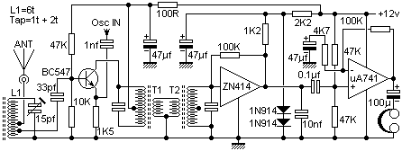 This is a project from the dim and distant past which has proved to be a real winner. I have used it as the basis for an 8 channel proportional R/C (AM) as well as a 145MHz FM "chat box". The receiver is very simple and is given above. It consists of a single transistor mixer then a ZN414 radio IC to provide the gain and detection. A 741 OP-AMP is used as the final audio stage, but this could be replaced with an LM380, if you want to drive a small loudspeaker.