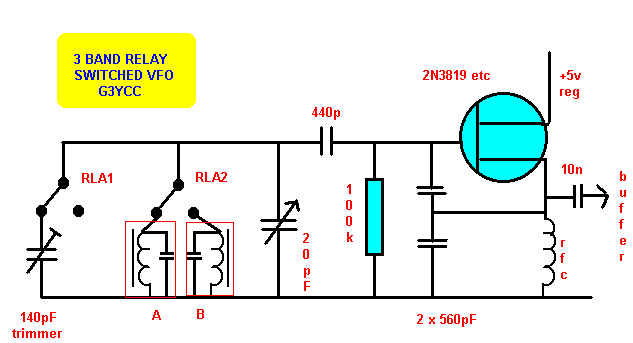 This VFO was described in Sprat 75 and I used it in a three band superhet transceiver for 80, 40 and 20 metres. It uses reed relays to switch in the various Toko coils and polystyrene capacitors as shown above. Coil A is KANK 3333 plus 100pF and B is KANK 3334 plus 220pf..