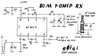 The circuit is of an 80 meter band one chip DC receiver, (excluding the AF stage). As you can see the design utilises the NE602 as VXO/mixer. It is economical with components