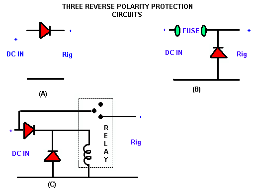 The first circuit, A, will cause a slight voltage drop especially if used to protect a circuit with higher current consumption. I use B in most of my rigs and C is more refined in that the relay will only work when the polarity is right. Because a relay is empolyed in C, there is however a little more current used.