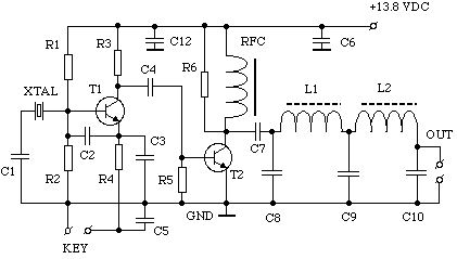 C1 = 47PF : C2, C3 = 1500PF : C4 = 0.01mfd : C5, C7 = 0.1mfd : C6, C12 = 0.047mfd : C8, C10 = 820PF : C9 = 1500PF : R1, R2 = 5K1 : R3, R5 = 100R : R4 = 180R : R6 = 1K2 : RFC = 22 MICROHENRIES (APPROX) : L1,L2 = 2.2 MICROHENRIES (21 TURNS ON T50-2) : T1 = 2N2369A : T2 = CB OUTPUT TRANSISTOR (2SC1237 OR SIMILAR) : XTAL 3.579MHZ (CHEAP COLOUR TV CRYSTAL) OR 3.560MHZ (QRP CW FREQUENCY)