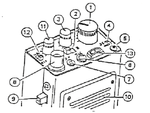 1 = TUNE, 2 = BAND SW, 3 = VOL/POWER, 4 = TX LED, 5 = PRESS BUTTON KEY (!) 6 = EXT MIC/PTT, 7 = EXT SPKR, PHONES, 8 = BNC ANTENNA, 9 = PTT, 10 = MIC/SPKR 11 = RIT, 12 = NOISE BLANKER, 13 = METER (TX PWR/S METER)