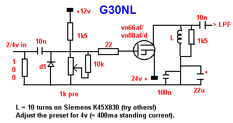 This circuit was described in Sprat 73 by G3ONL and is capable of 5 watts out on all bands. Diode D1 is included to protect the power device, preferrably a hot carrier or gold bonded germanium diode. Suitable devices are the VN66AF or VN88AF, both are available from Electrovalue in UK, as is the ferrite.