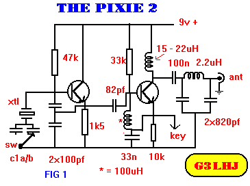 The two switched capacitors in series with the crystal are 1000pF and 40pF and, with the switch used as a T/R switch, give 600Hz offset. A PP3 9v battery is used to power the rig. Suitable transistors for the transmit portion (fig 1) would be BC107/BC108 etc for the crystal oscillator and an 2N3866/2N3053/BF51 etc in the 'PA'. The crystal is an 80m one - 3.560 mHz being the QRP activity channel. Figure 2 shows the receive side.