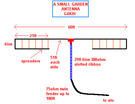 This antenna was described by Bill, G4KIH in Sprat 52 and is actually a G5RV modified to fit into a small space. Although a compromise, it performs well. Spacers made from glass fibre sheet cut into strips was used, each 6 inches long. The parallel antenna wires are secured with wire wraps.