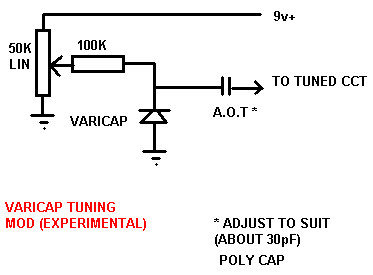 It is built on a PCB about 2" x 2" and can be made for any one of the 160 - 20 metre HF bands.The inductors used are in the Toko range, available from Cirkit. Capacitors involving the tuned circuit constituing the VFO should be polystyrene, to reduce drift. Suitable tuning capacitor would be a 50pF variable, found regularly at rallies, or may be in your junk box! Instead of using capacitive tuning, a useful modification would be to employ a varicap diode as shown below.